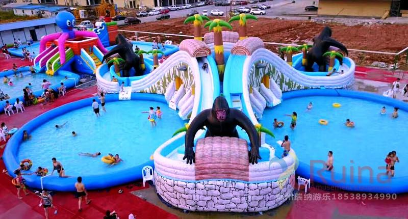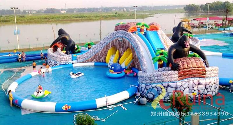 以猩猩林中搬運(yùn)物品嬉戲?yàn)橹黝},人在林中穿梭,從而達(dá)到人景合一的境界;在設(shè)計(jì)結(jié)構(gòu)上是以三個(gè)對(duì)稱的滑梯組成,加上噴水的效果,給人以視覺(jué)上對(duì)稱的美感!每個(gè)滑梯下面都配有一個(gè)充氣水池,水池中放些水上浮具,如香蕉船、水狗、冰山等,讓移動(dòng)水上樂(lè)園的玩法更加豐富。